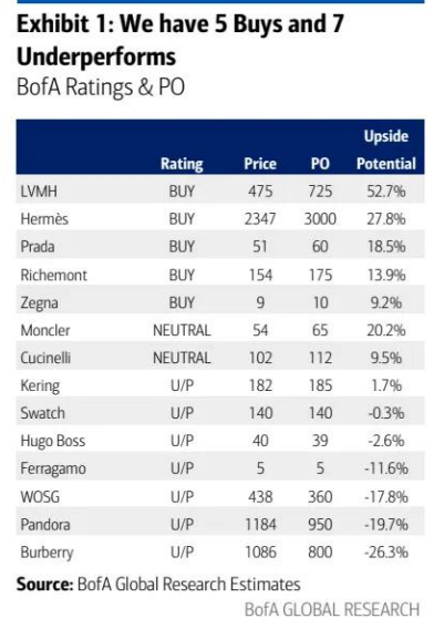 美银认为,今年 9 月 / 10 月的时装秀更为重要(但大多不会成为催化剂),因为这些秀将帮助我们了解是否有足够的新品(以更低的价格)来推动 2026 年的销量复苏,以及哪些品牌将引领这一复苏。